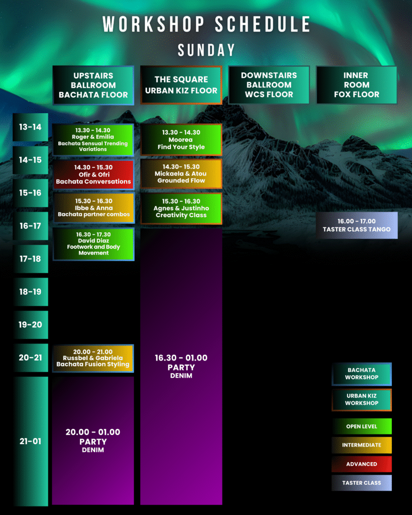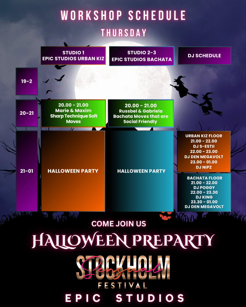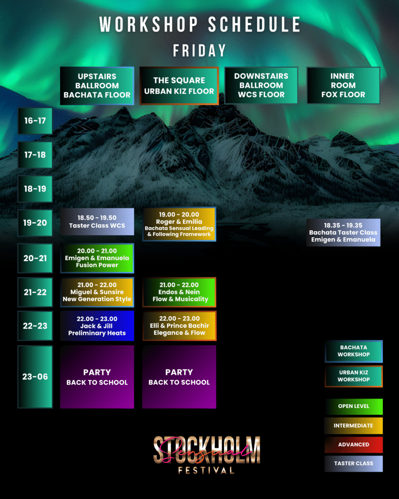 Cannot wait? Warm up with the first Bachateros and Kizomberos arriving in the city! The pre-party will be held at Epic Studios in Gullmarsplan with workshops from 20 – 21 and social dancing until 0100. The entrance tickets will be sold at the door. Here is the event link.